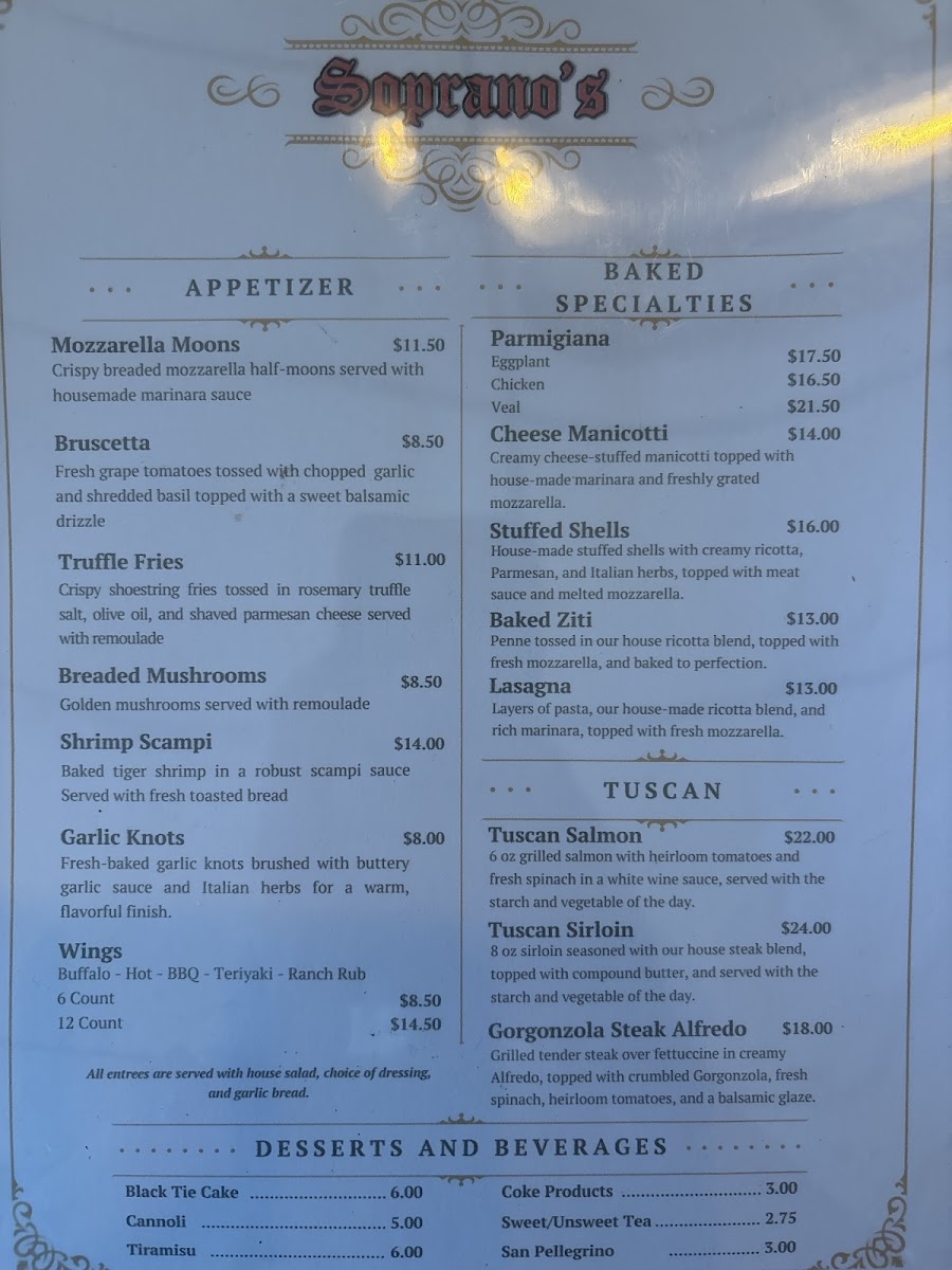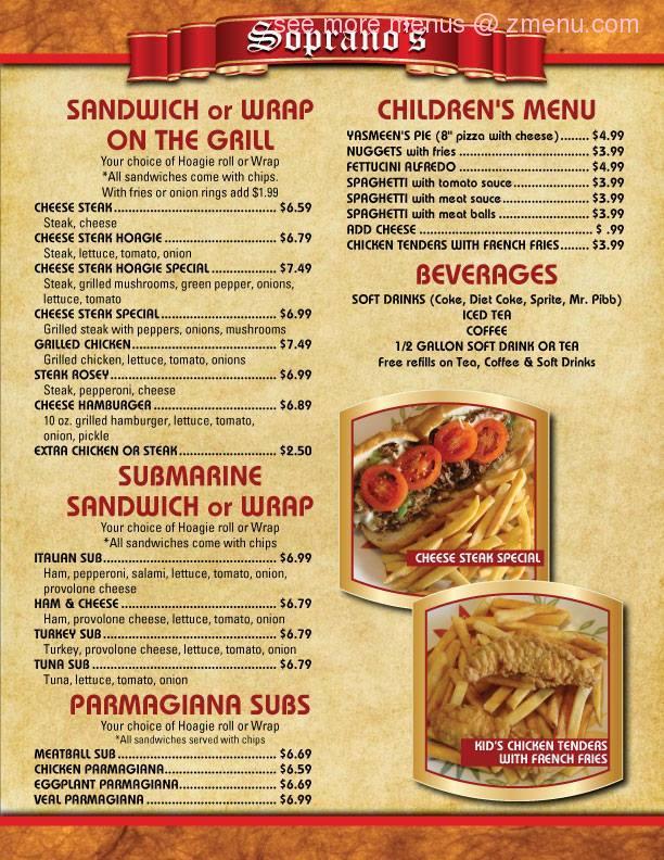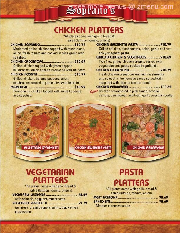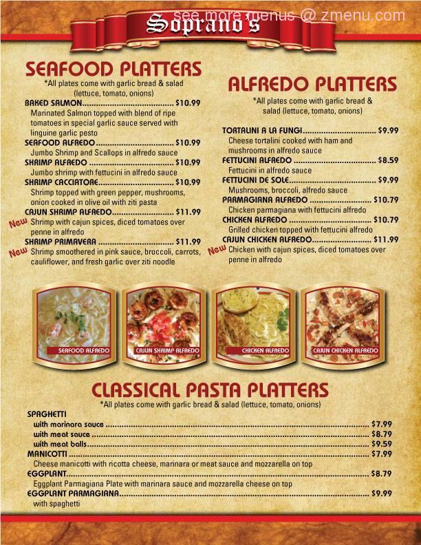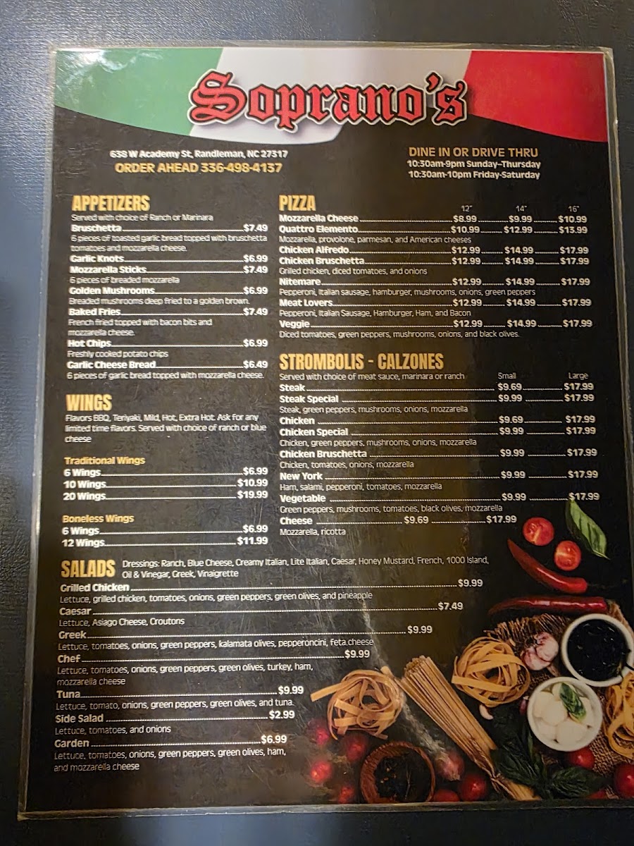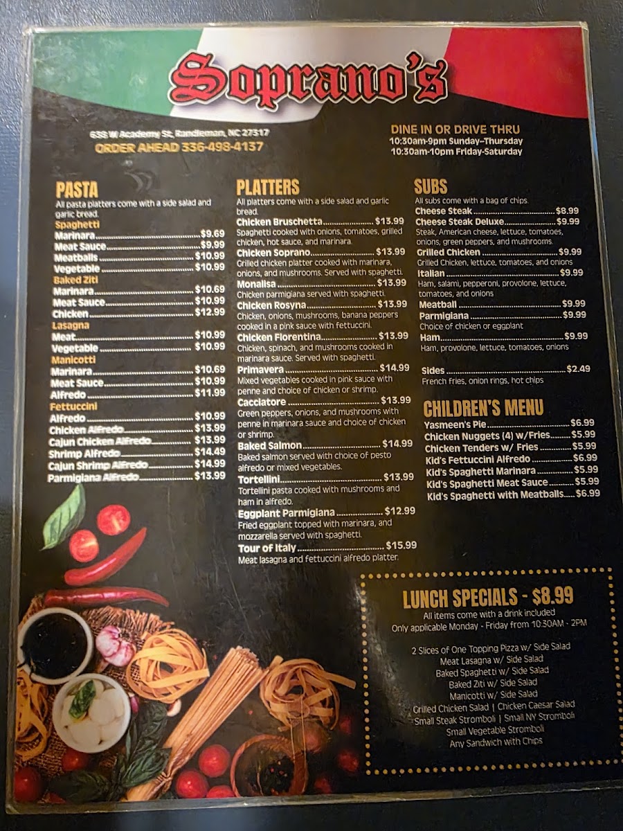 The moment you step into Soprano's Italian Restaurant, you're greeted with the comforting aromas of fresh, home-cooked Italian classics. Whether you're craving a rich pasta dish, a flavorful pizza, or something off the grill, the Soprano's Italian Restaurant Menu has something to satisfy every taste. From their signature lasagna to a variety of hand-tossed pizzas, each dish is prepared with the finest ingredients, ensuring an authentic Italian experience right in the heart of Randleman. The menu offers a delightful selection of appetizers, hearty entrées, and indulgent desserts, all crafted to make you feel like you're dining in a cozy family kitchen. Pair your meal with a glass of wine or a refreshing cocktail for the perfect dining experience.